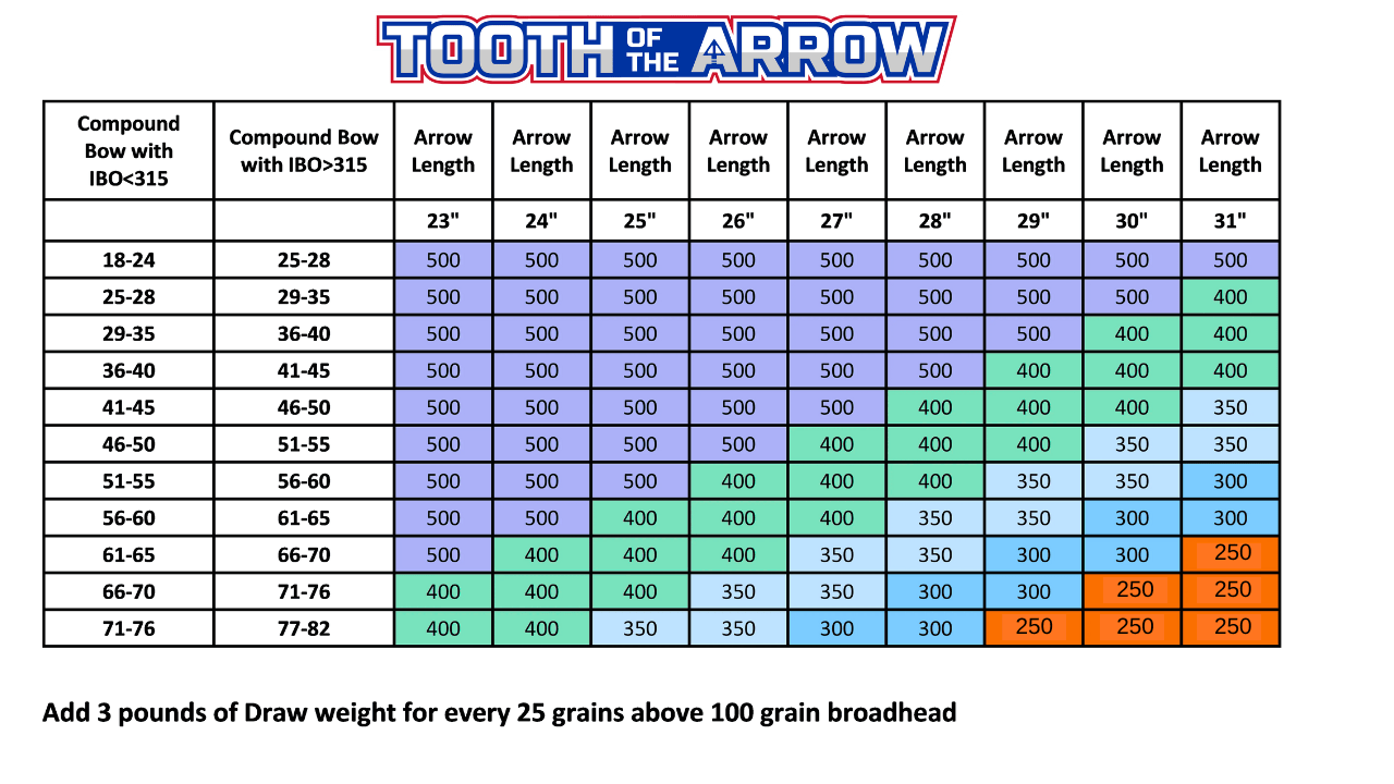 A: Spine depends on draw weight, arrow length, and point weight. Use our Spine Selector Tool or email us at customercare@toothofthearrowbroadheads.com with your bow specs, and we’ll help you pick the right spine for your setup.